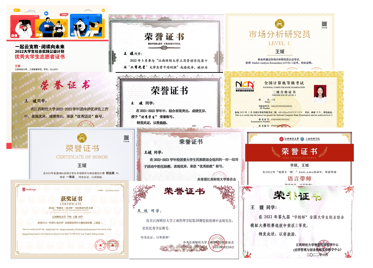 王媛始终认为作为一名学生,要始终把学好专业本领摆在首位。学习上,王媛刻苦认真,不断提升专业水平,连续两年综测优秀。在过去的两年里,王媛的成绩稳步提升,加权成绩实现了由最初的87.82上升至当前的92.24,获得了专业前三的成绩。王媛时刻提醒自己要不断前行,自立的同时更需自强。她积极参与各项活动,累计参加活动次数高达140余项。多次参与各类课题与比赛,作为核心成员参与三下乡课题的申报,并获优秀调研报告。作为负责人组织参加江西省大学生科技创新大赛,获得省赛二等奖。